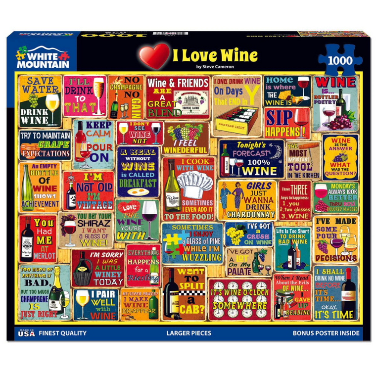 The puzzle's artwork is filled with amusing and relatable wine-themed quotes and illustrations, making it not only a challenging puzzle but also a source of entertainment as you piece it together.